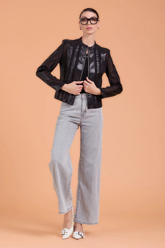 Giacca in pelle e trasparenze