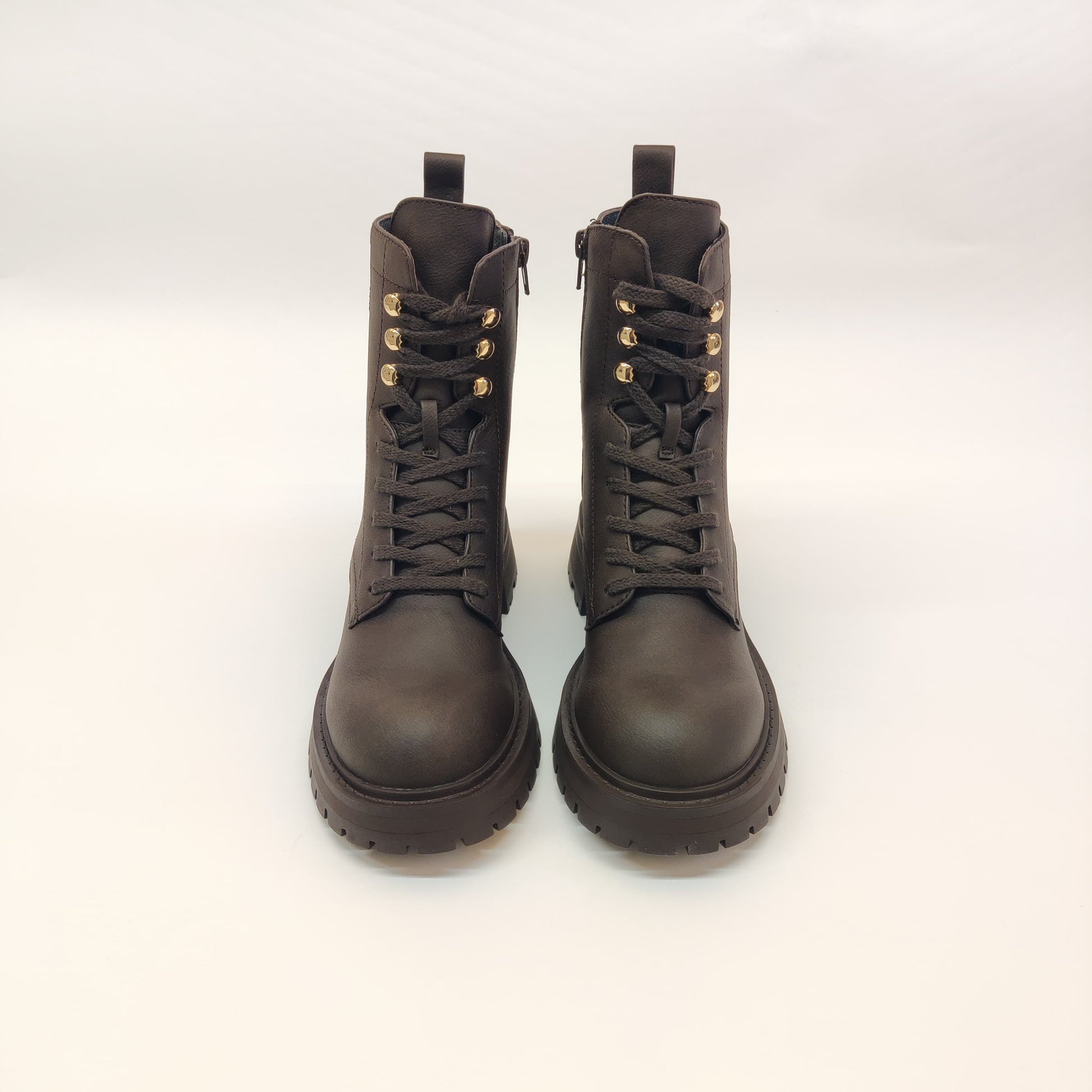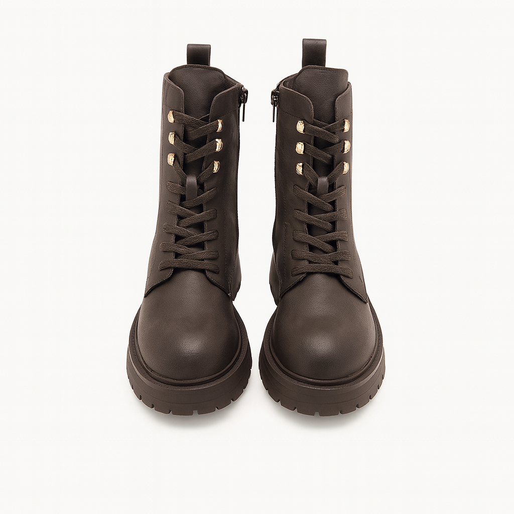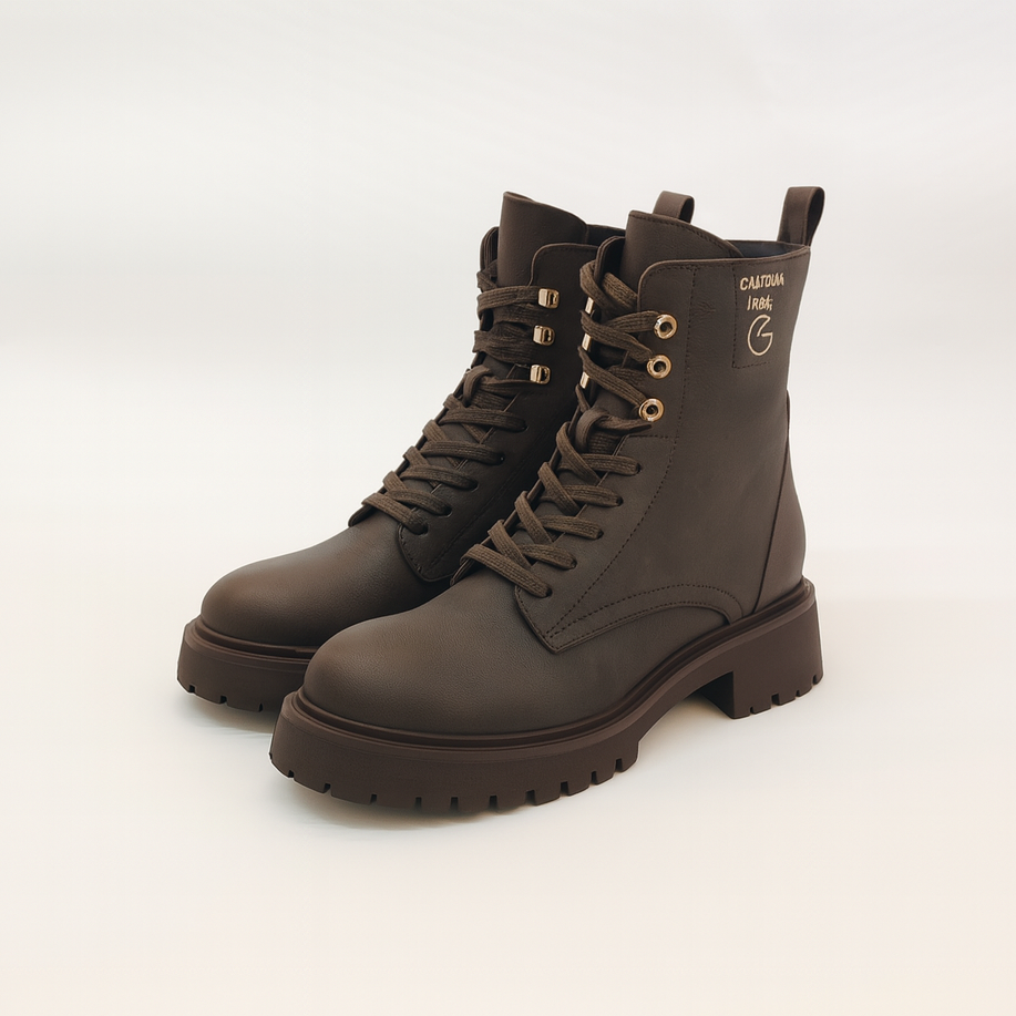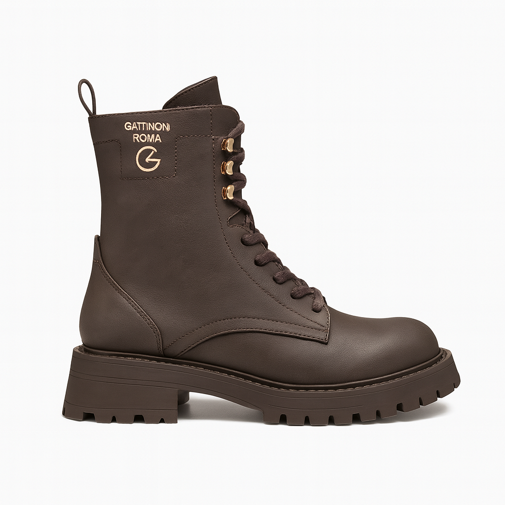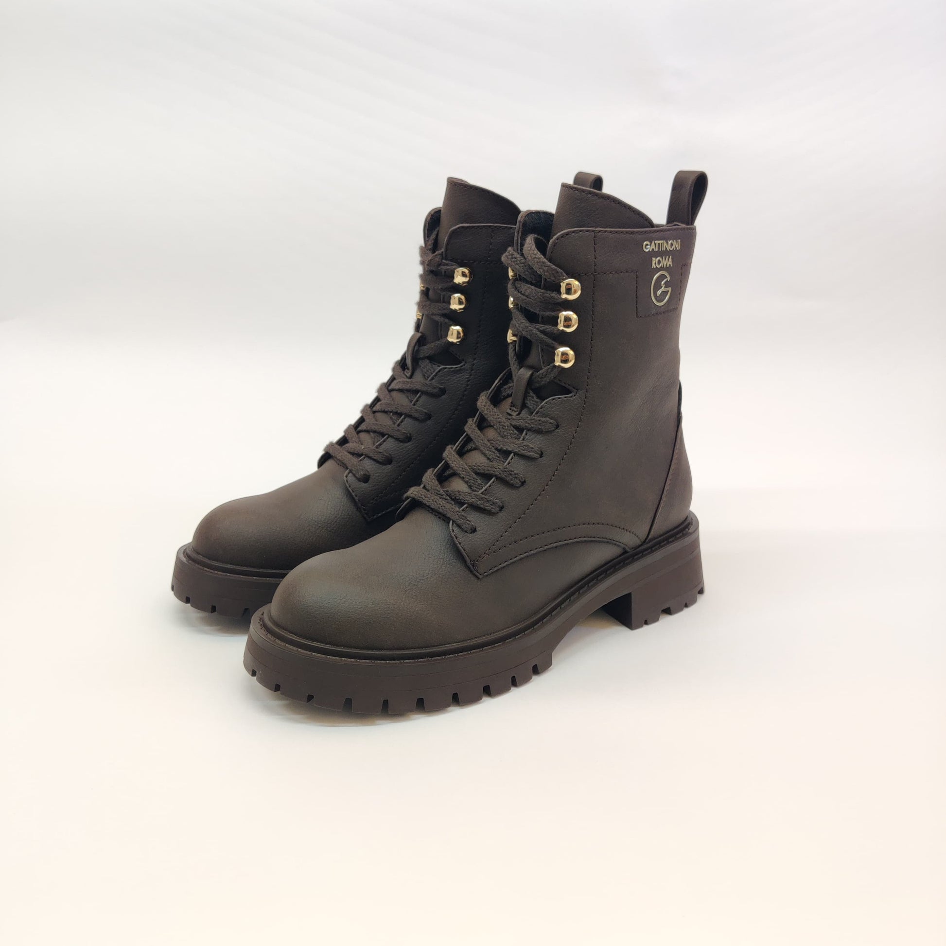 Tessuto spalmato, brand logo, tinta unita, interno in pelle, stringhe, zip, punta stretta, tacco squadrato, in gomma, zeppa in gomma, suola carrarmata, contiene parti non tessili di origine animale.