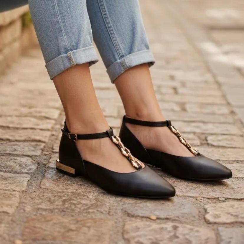 Ballerine Gioseppo in pelle con catena dorata e tacco metallico. Punta affusolata. Hanno una suola imbottita, cinturino a T e chiusura regolabile stile bracciale. Altezza tacco: 1,5 cm. Fodera in pelle e poliuretano. Tomaia e suola in pelle. Suola flessibile in TPR.