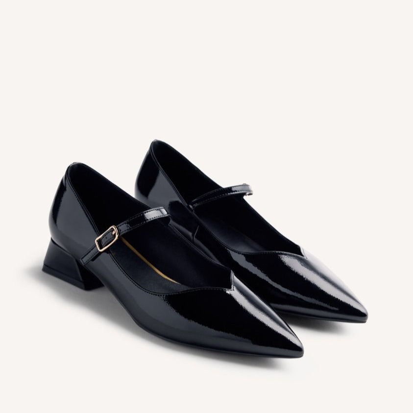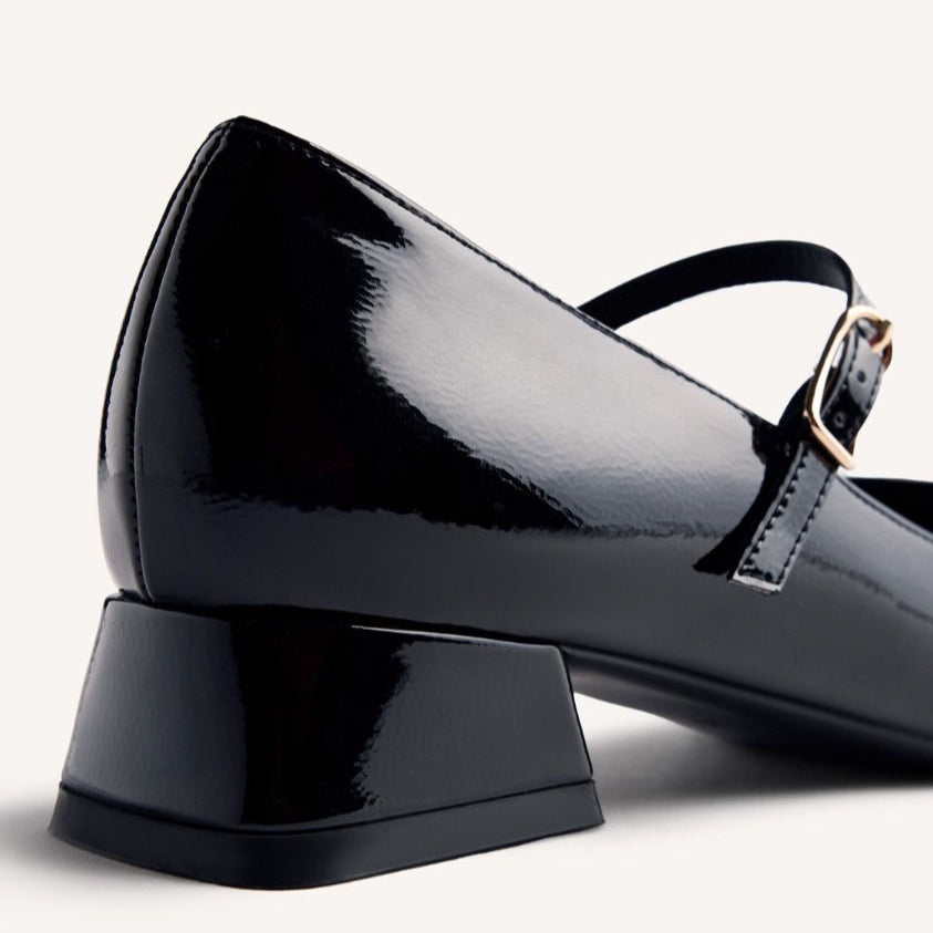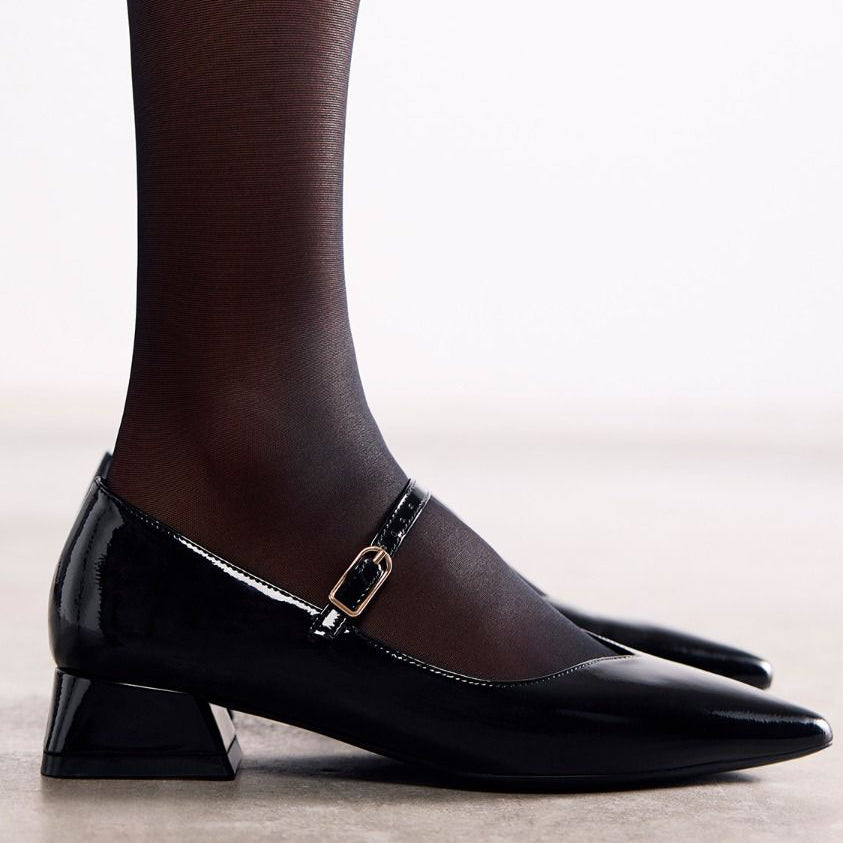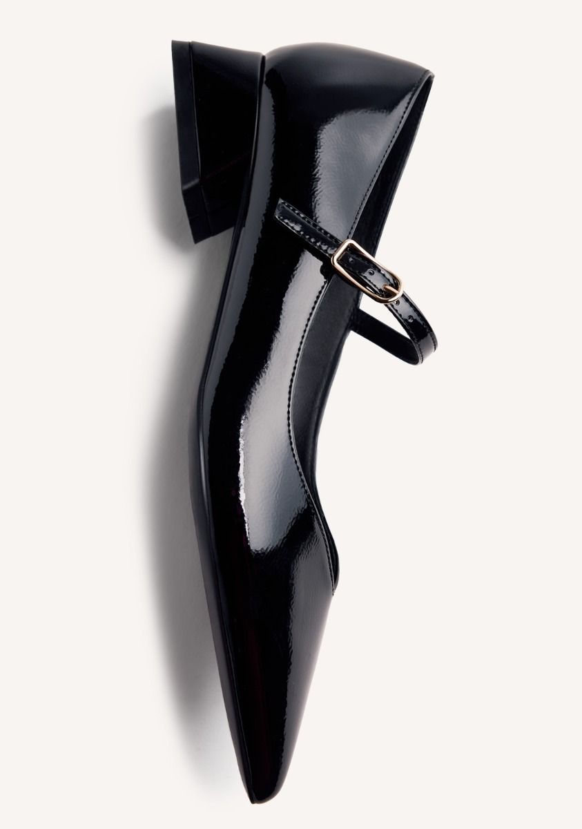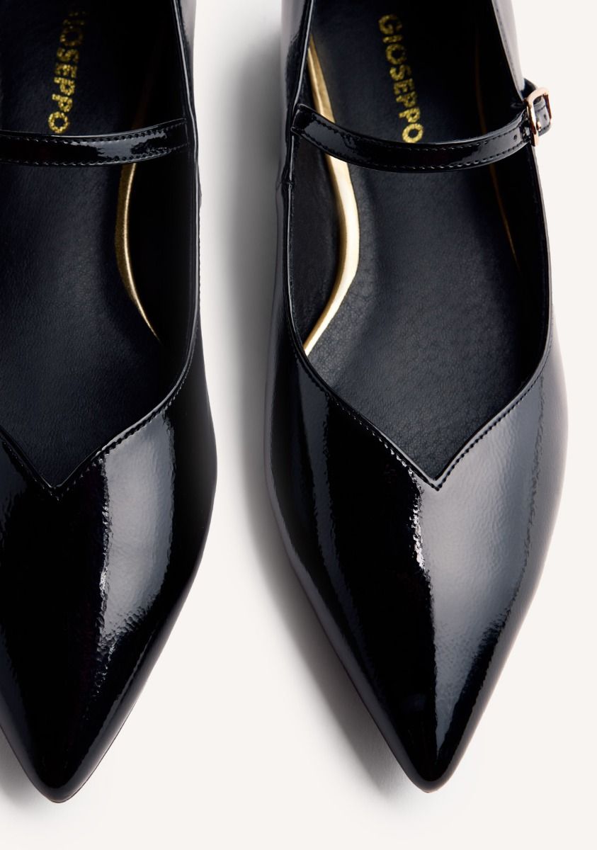 Scarpe con tacco e finitura in vernice. Punta affusolata. Presentano una soletta imbottita, un tacco basso a blocco e una chiusura regolabile sul collo del piede. Altezza tacco: 3 cm. Tomaia, fodera e soletta in poliuretano. Suola in gomma flessibile.