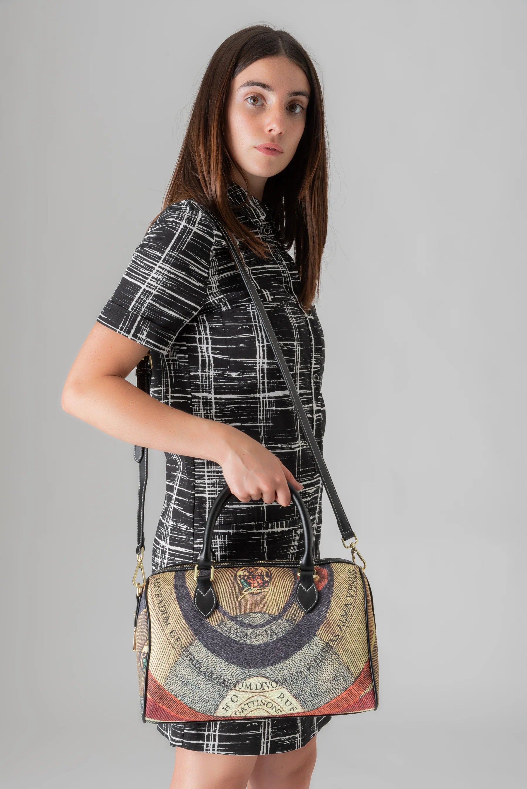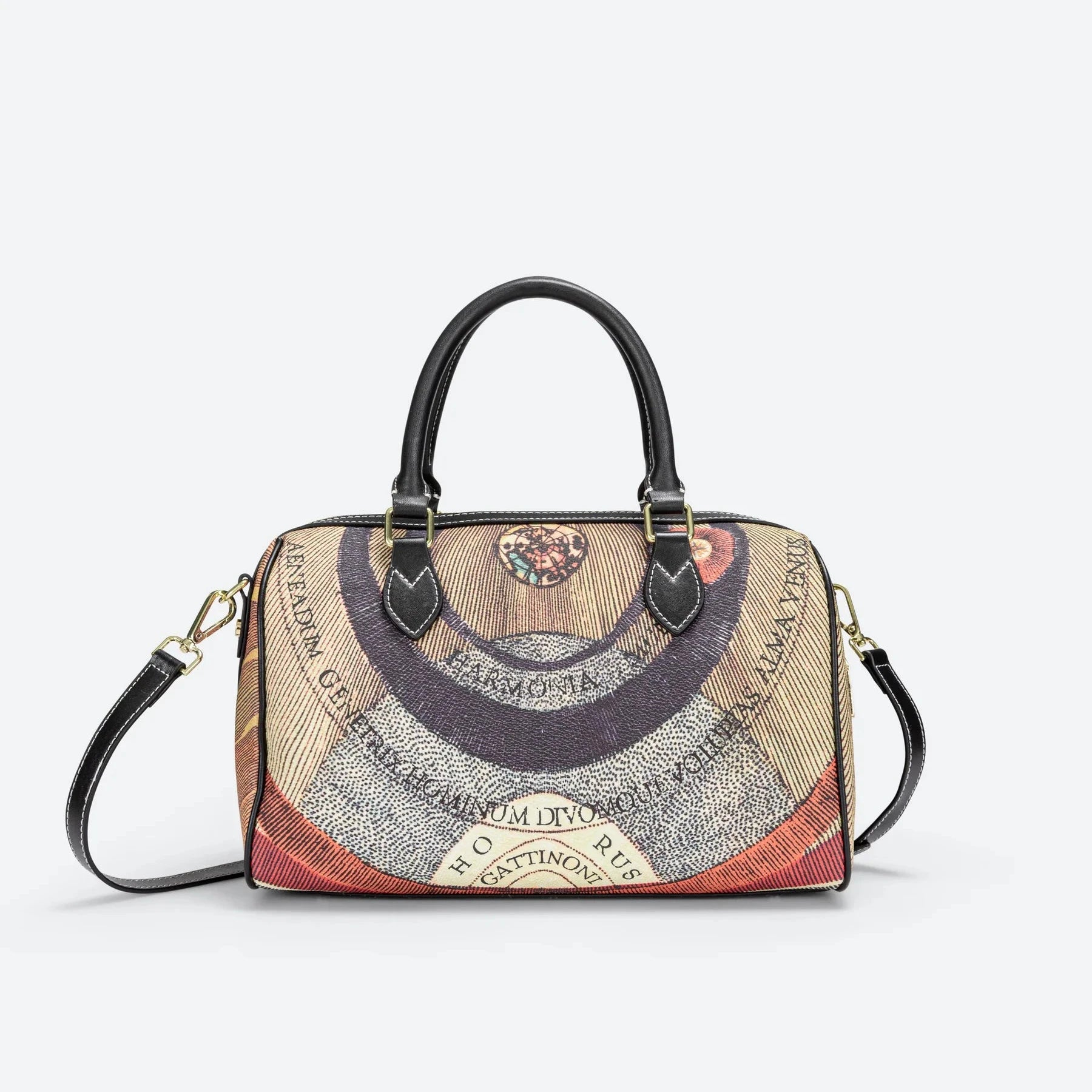 Borsa a mano Gattinoni Planetarium dallo stile iconico e raffinato. Realizzata in tessuto stampato con il celebre motivo Planetarium, presenta dettagli in ecopelle nera che ne esaltano l’eleganza e la struttura. La silhouette a bauletto conferisce un tocco classico e senza tempo, perfetto per ogni occasione.