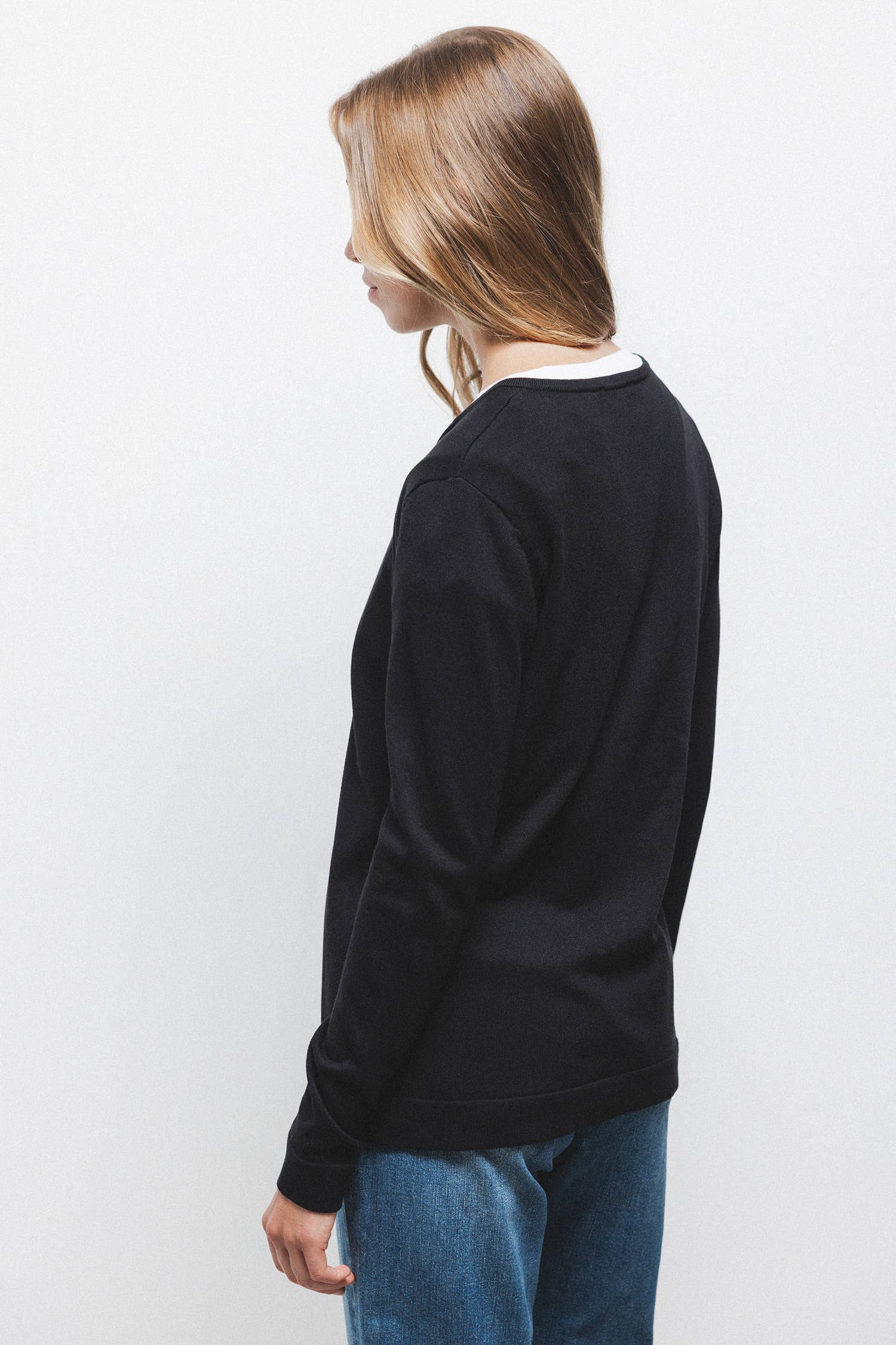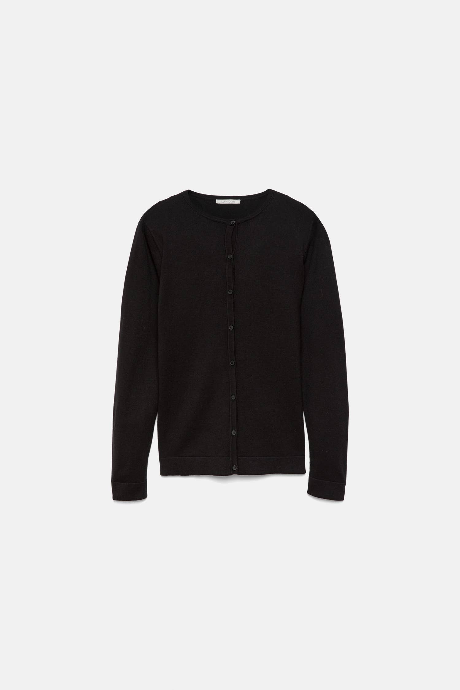 Cardigan in maglia rasata. Apertura frontale con chiusura a bottoni. Finiture a coste. Tessuto: 78% Viscosa, 22% Poliammide