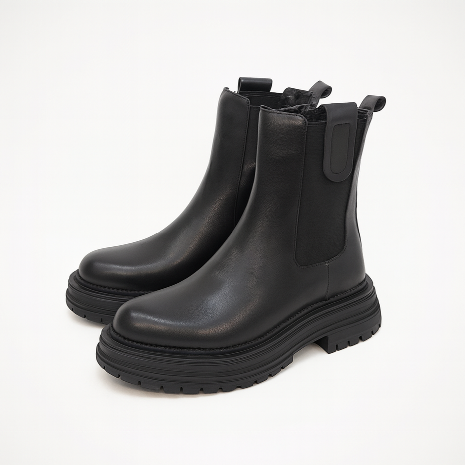 Un’icona di stile rivisitata in chiave moderna. Questo Chelsea boot in morbida pelle nera combina linee pulite ed essenziali con una suola carrarmata spessa che assicura comfort e stabilità. Gli inserti elastici laterali e i tiranti posteriori rendono la calzata pratica e veloce. Perfetto per un look urbano e contemporaneo, da indossare ogni giorno con grinta.