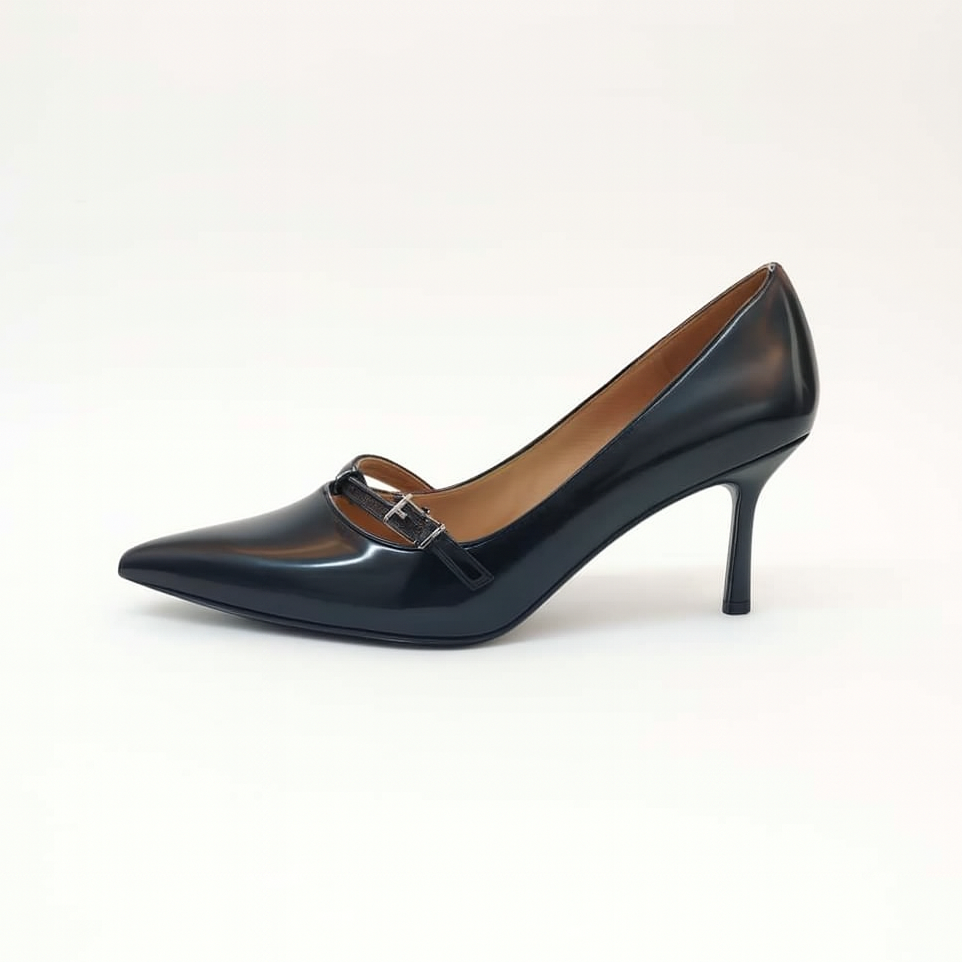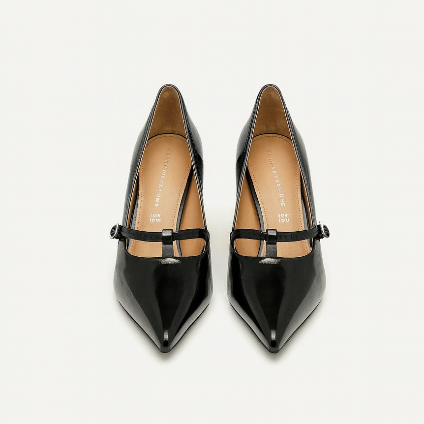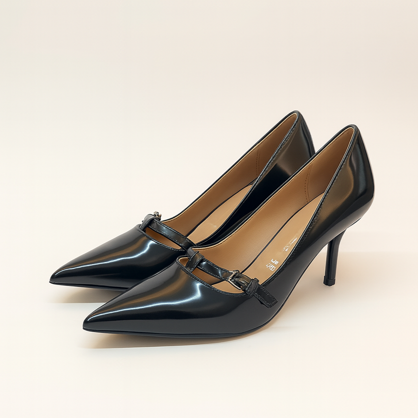 Eleganti décolleté in pelle nera dal design raffinato e femminile. La punta affusolata slancia la silhouette, mentre il sottile cinturino con fibbia aggiunge un tocco sofisticato e garantisce una calzata stabile. Il tacco a stiletto medio conferisce altezza e slancio senza rinunciare al comfort. Perfette per completare look da ufficio, serate eleganti o occasioni speciali.