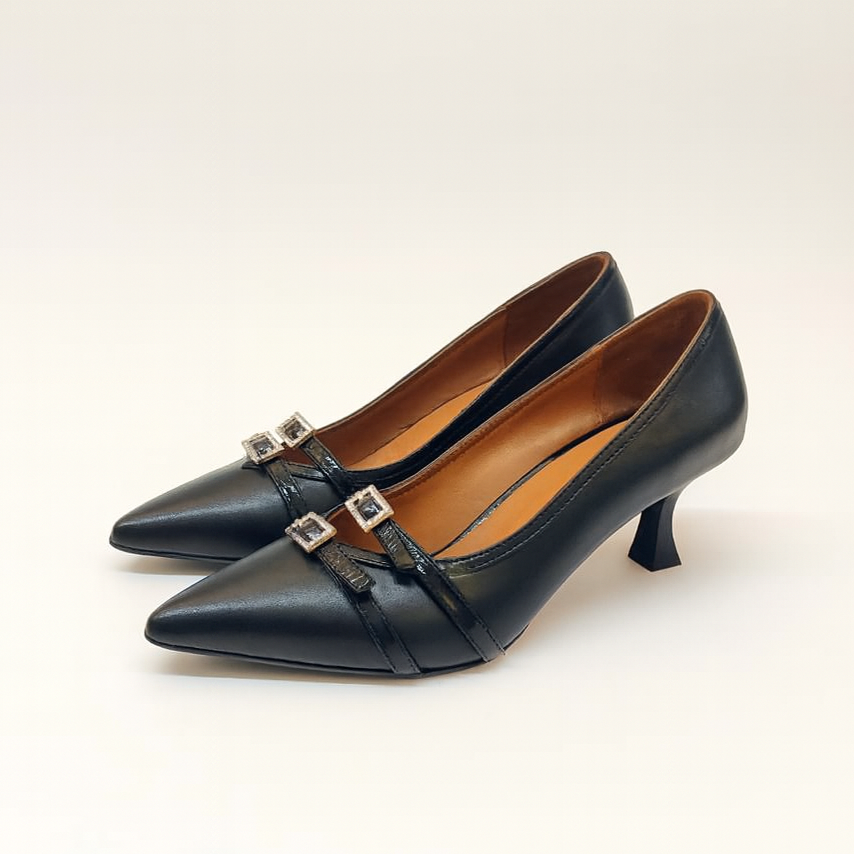 Un modello intramontabile che unisce eleganza e modernità. Questa décolleté in pelle nera presenta una linea affusolata con punta a lancia e tacco medio a rocchetto, perfetta per slanciare la figura mantenendo il massimo comfort. Le doppie fibbie gioiello sulla tomaia donano un tocco luminoso e sofisticato, ideale per completare look formali o da sera.
