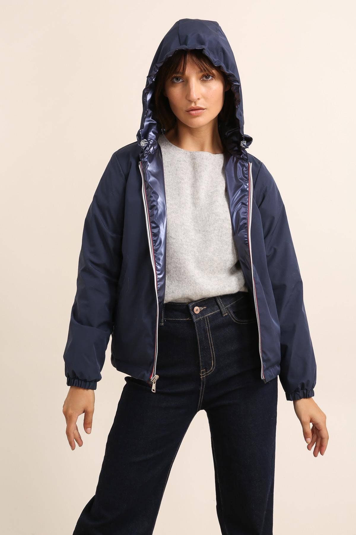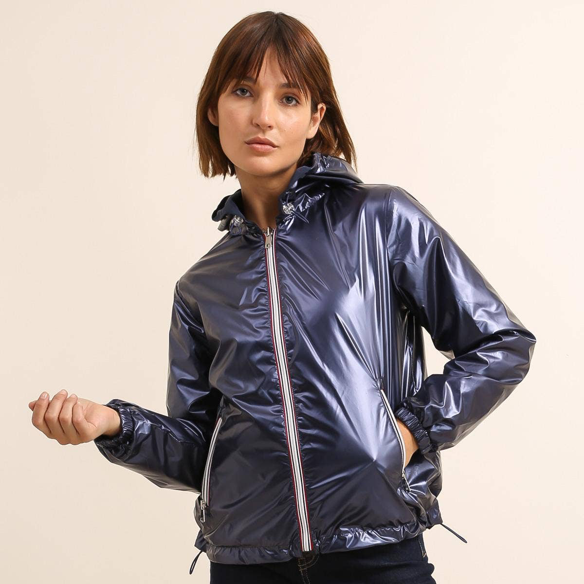 Antivento corto con cappuccio reversibile, impermeabile per la pioggia, dotato di tasche e chiusura centrale con zip multicolore.