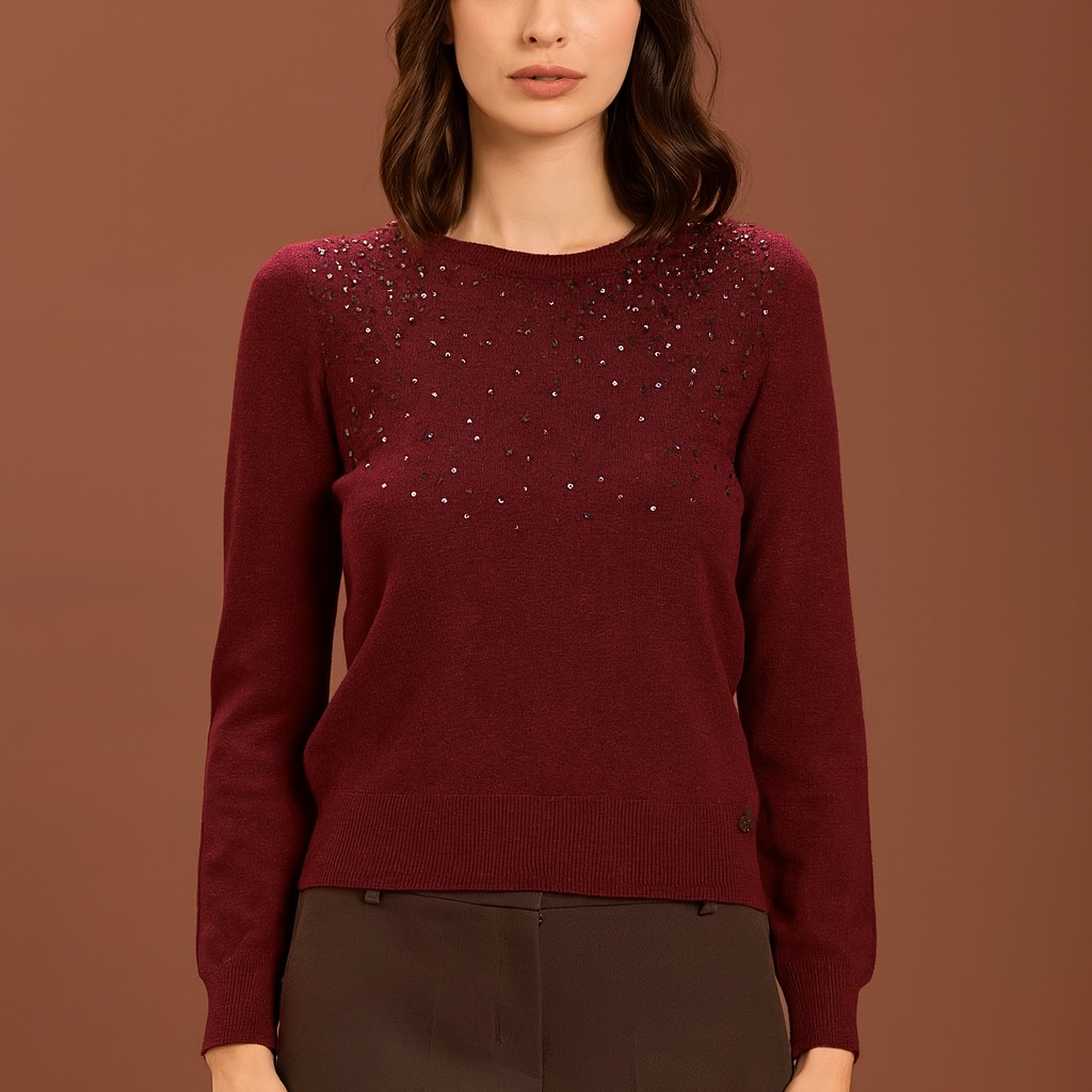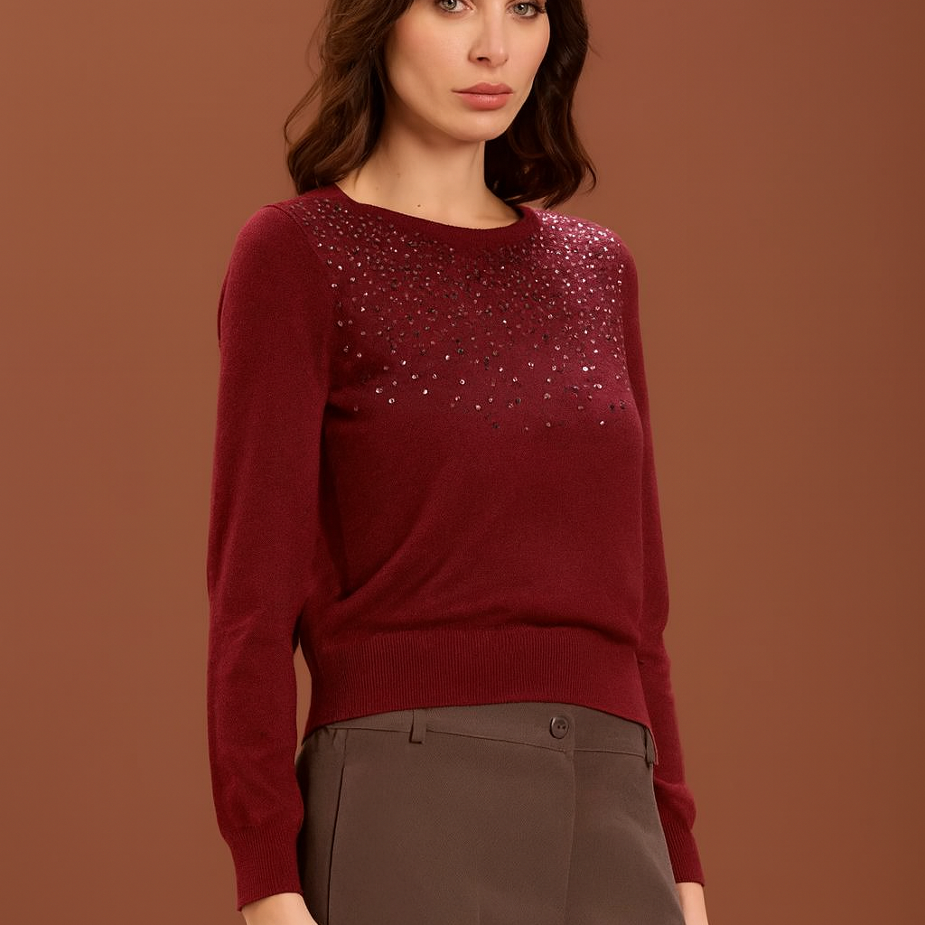 Elegante pullover bordeaux con dettagli luminosi. Taglio classico con girocollo e maniche lunghe. Il bordo inferiore, i polsini e lo scollo presentano una lavorazione a costine sottili. La parte superiore del davanti è impreziosita da piccoli strass o paillettes tono su tono che catturano la luce, creando un effetto elegante e raffinato senza risultare eccessivo. Vestibilità: regolare e leggermente aderente al punto vita, valorizza la figura in modo sobrio e femminile.