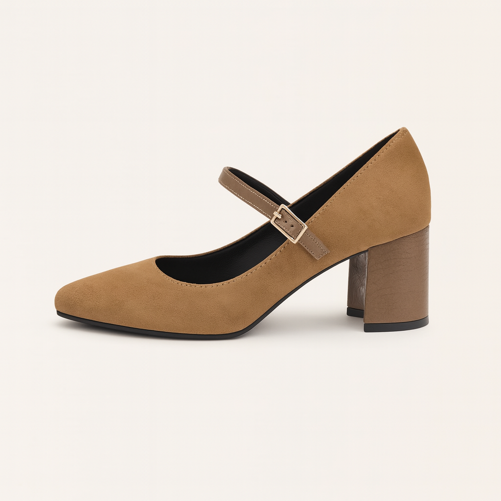 Un’elegante rivisitazione di un grande classico: la Mary Jane. Realizzata in morbido camoscio color camel, avvolge il piede con raffinatezza e versatilità. Il cinturino alla caviglia in vernice tono su tono, come anche il tacco a blocco di 7 cm, aggiunge un contrasto luminoso e sofisticato. Una scarpa che unisce comodità e femminilità, perfetta per look da giorno e da sera, capace di completare sia outfit formali che casual chic.