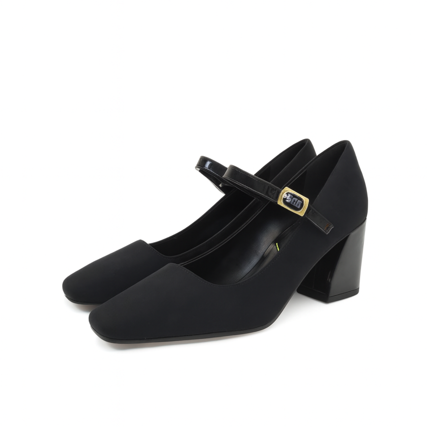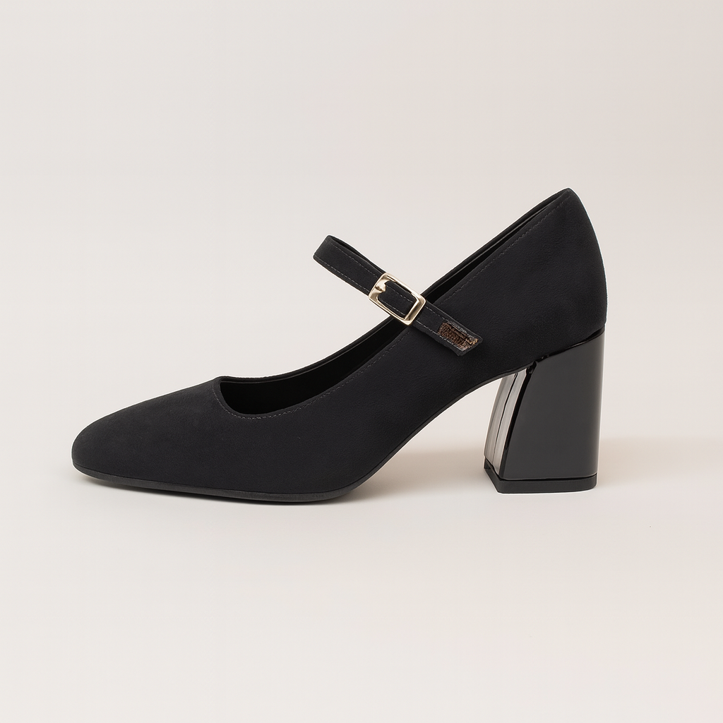 Un’elegante rivisitazione di un grande classico: la Mary Jane. Realizzata in morbido camoscio nero, avvolge il piede con raffinatezza e versatilità. Il cinturino alla in vernice tono su tono, come anche il tacco a blocco di 7 cm, aggiunge un contrasto luminoso e sofisticato. Una scarpa che unisce comodità e femminilità, perfetta per look da giorno e da sera, capace di completare sia outfit formali che casual chic.