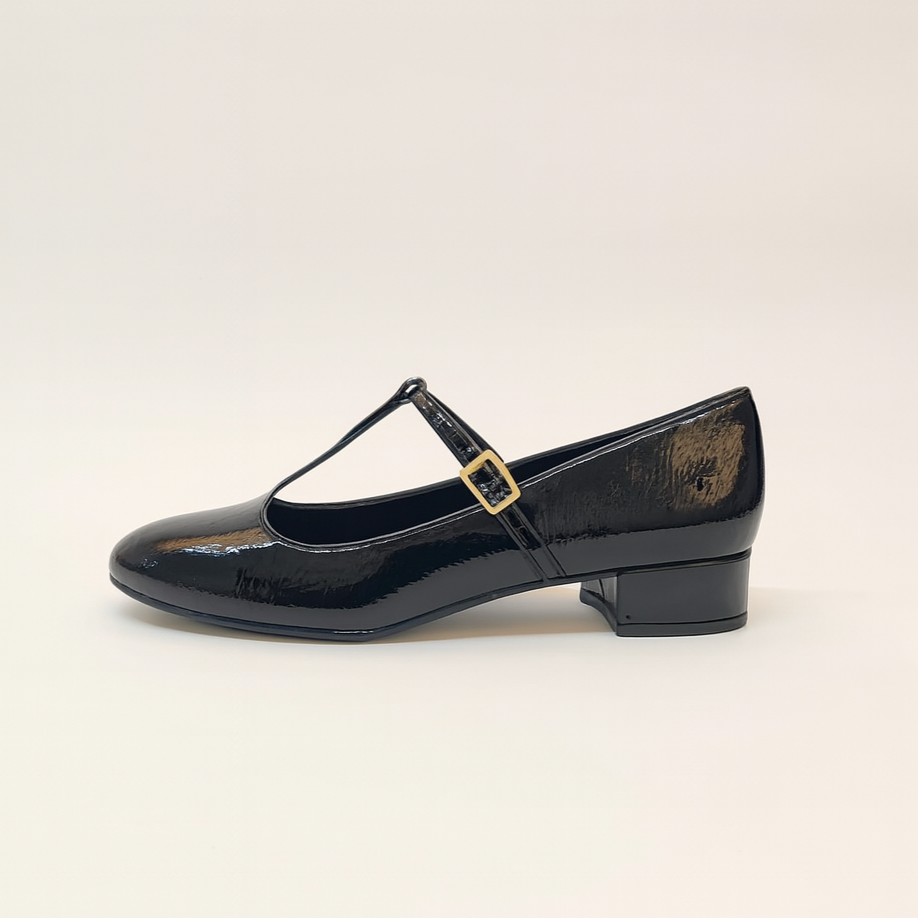 Mary jane nera in vernice con punta tonda tacco 3cm e cinturino modello t-bar