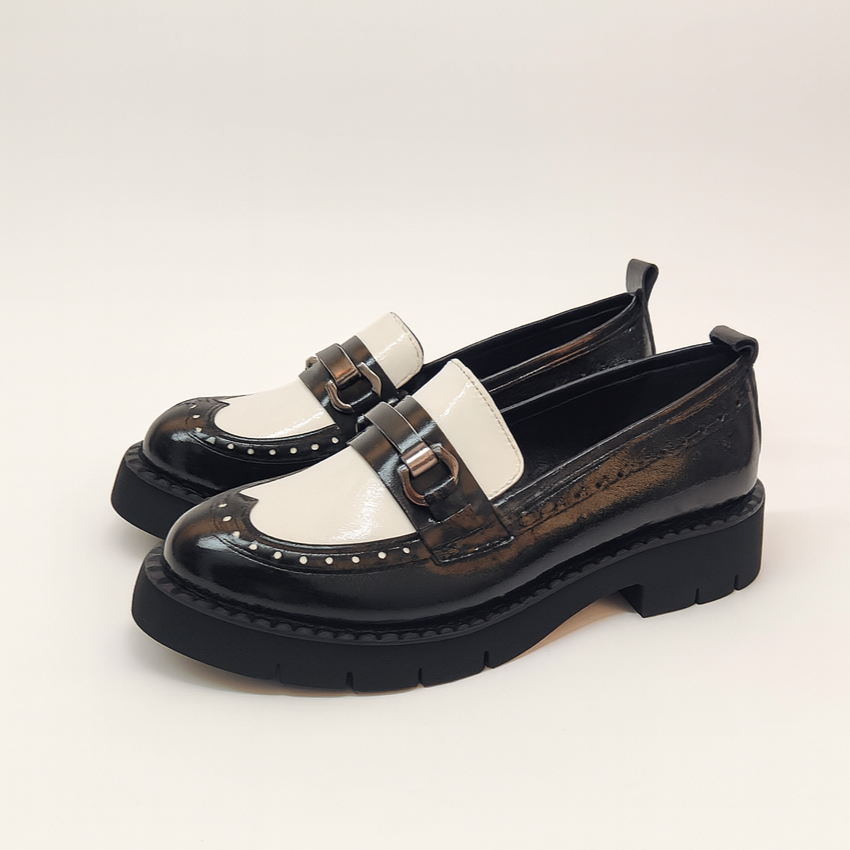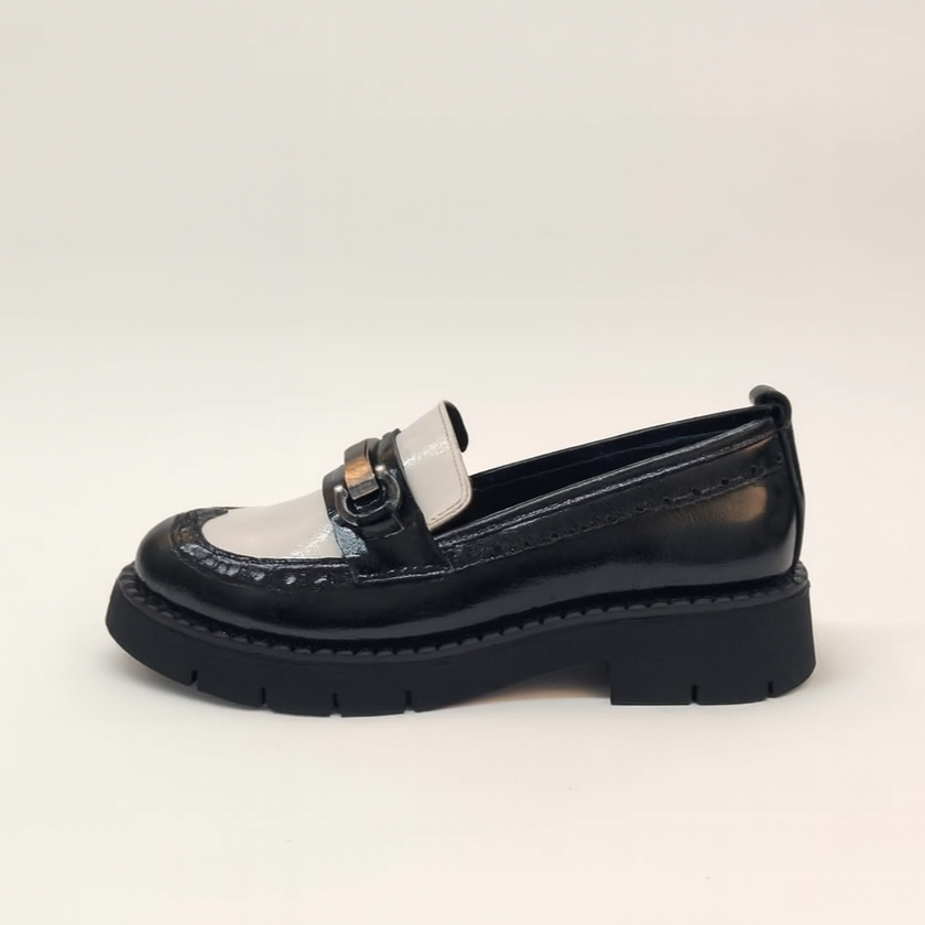 Un modello dallo stile deciso e contemporaneo, perfetto per chi ama distinguersi. Questo mocassino in pelle verniciata combina il contrasto raffinato tra bianco e nero con dettagli decorativi che richiamano il classico gusto inglese. Il fondo carrarmato in gomma garantisce comfort e stabilità, mentre la fibbia frontale aggiunge un tocco di carattere urbano e moderno.