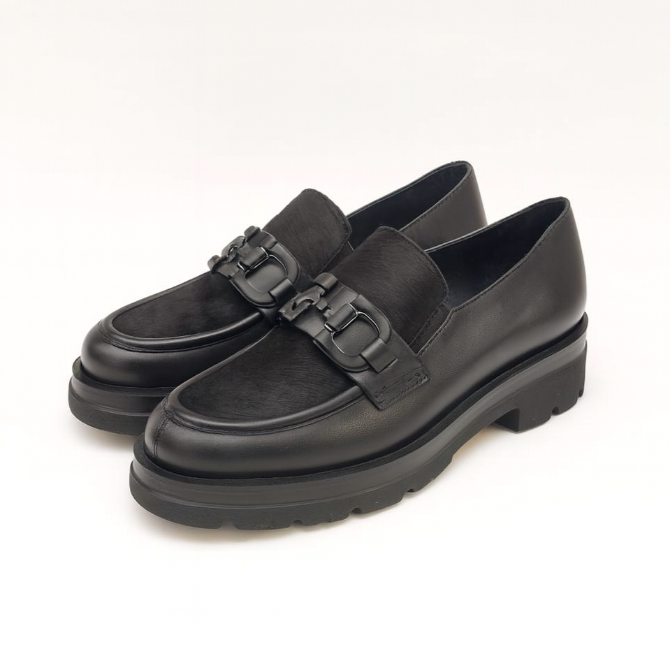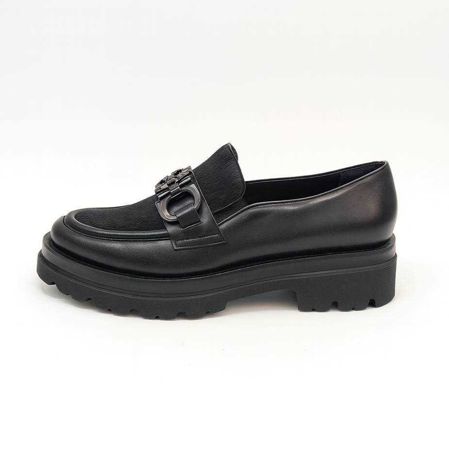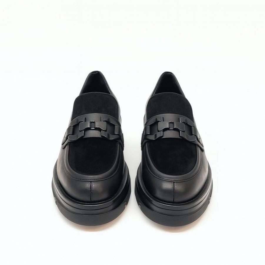 Questo mocassino nero combina materiali di alta qualità con una pregiata pelle, arricchito da un elegante accessorio applicato che dona un tocco distintivo. La sua costruzione versatile offre comfort e stile, ideale per completare con raffinatezza ogni look formale o casual.