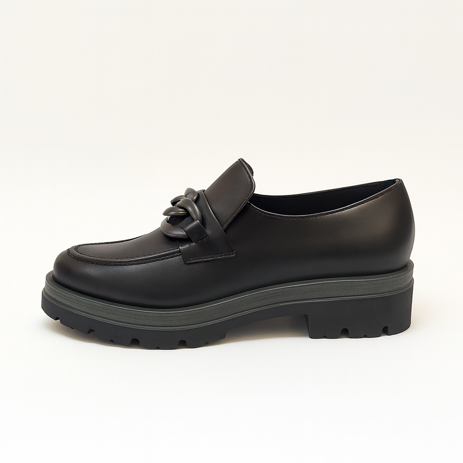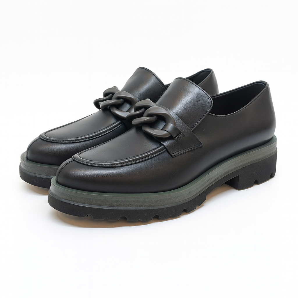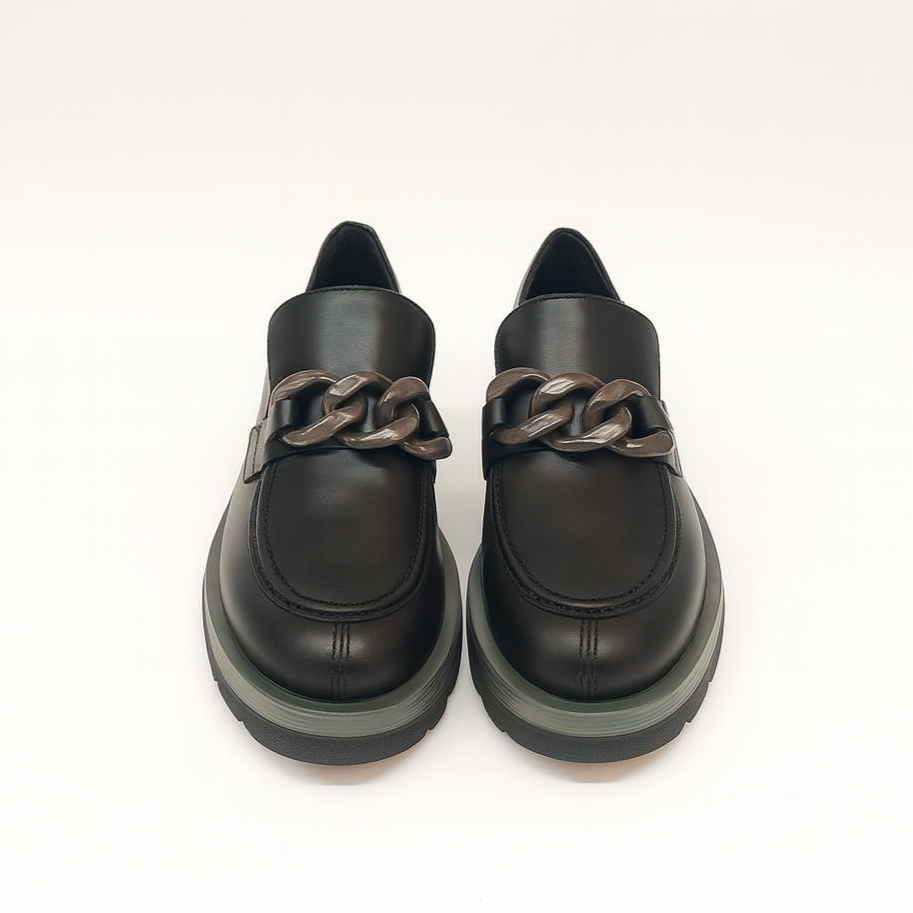 Elegante mocassino in pelle di alta qualità, caratterizzato da una para con dettaglio verde che aggiunge un tocco distintivo al design classico. La catena decorativa completa lo stile raffinato, offrendo un equilibrio perfetto tra tradizione e modernità. Ideale per chi cerca comfort senza rinunciare a un look sofisticato e originale.