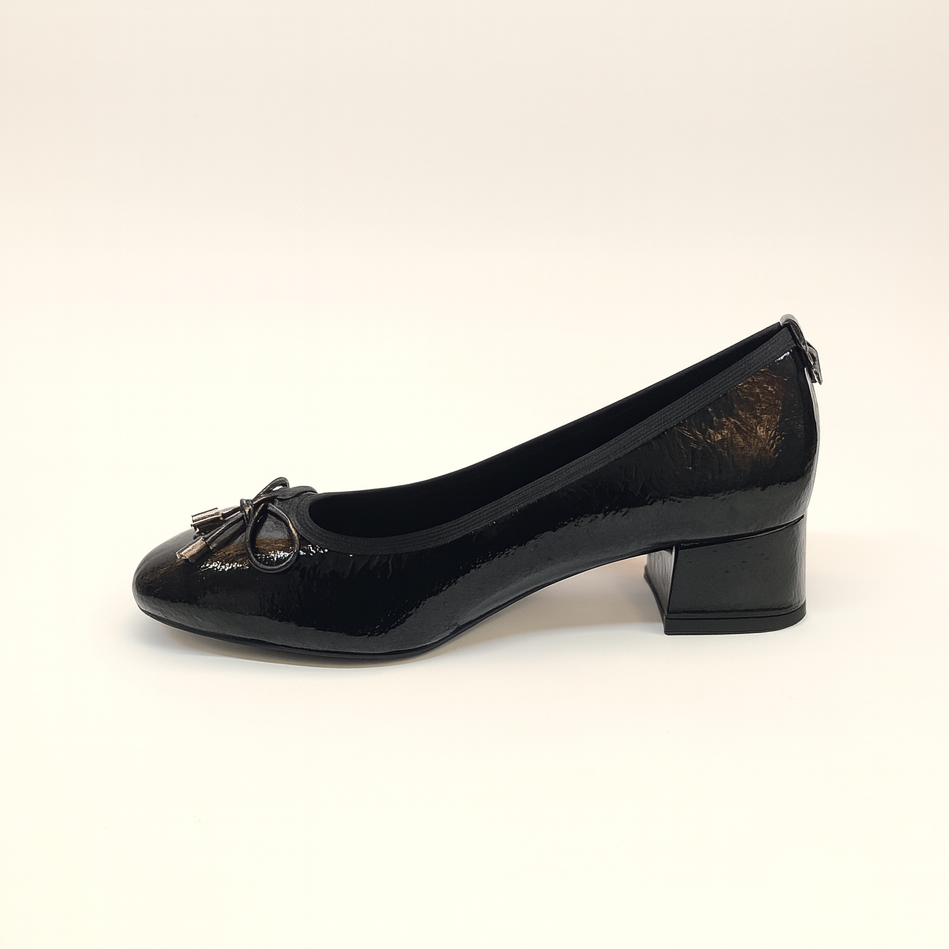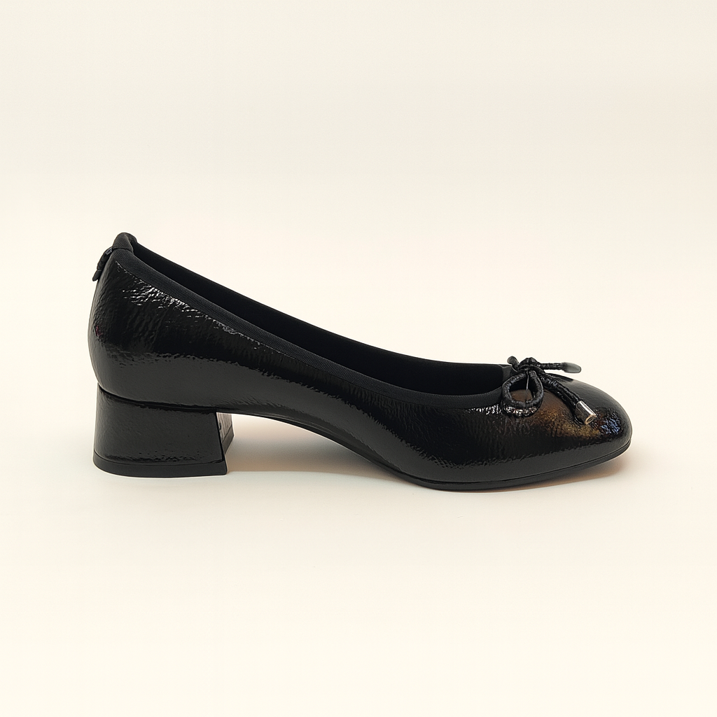 Scarpa da donna del marchio Xti. Realizzata in pelle verniciata. Caratterizzata da un grazioso fiocco. Comodo tacco di 4 cm con suola in gomma antiscivolo