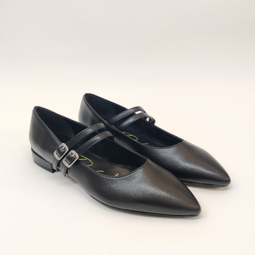 Scarpa Mary Jane in vera pelle nera, elegante e confortevole con tacco basso. Il doppio cinturino aggiunge stabilità e stile alla tua camminata. Perfetto per un look alla francese, dal gusto classico e femminile.