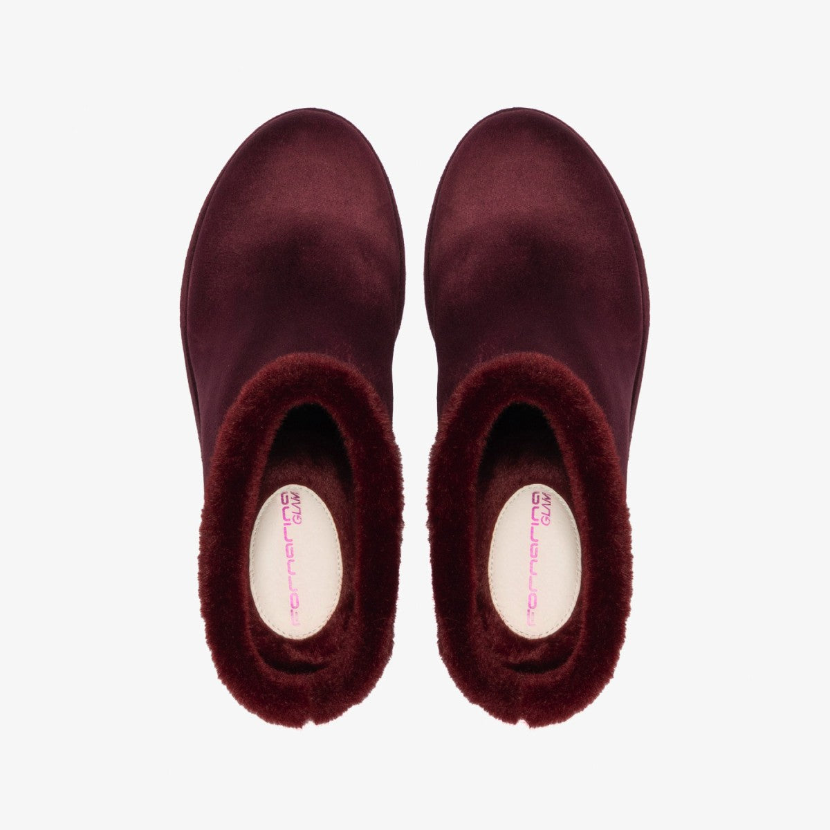 Vibes anni '70 e trend contemporanei. I sabot scamosciati rosso ciliegia con zeppa, interno caldo in eco-pelliccia e iconica suola pink firmata Fornarina, reinterpretano lo stile rétro con un twist moderno. Un dettaglio di carattere per affrontare la stagione fredda con stile.Altezza tacco 9,5 cme platform 4,5 cm.