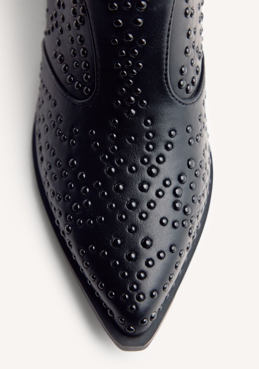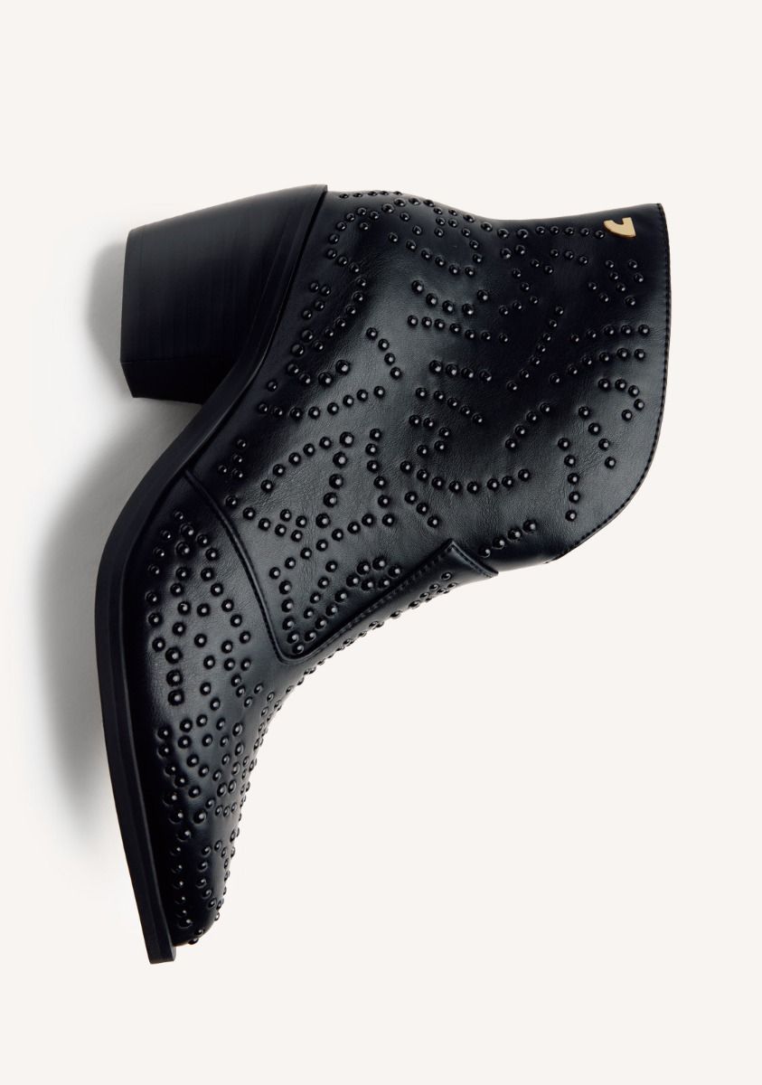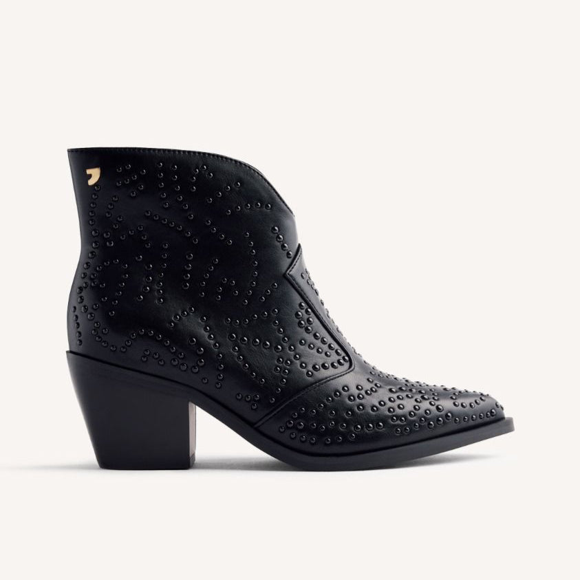 Stivaletti alla caviglia in stile cowboy con borchie abbinate. Punta affusolata e tacco cubano. Hanno una soletta interna in pelle imbottita e una cerniera sul lato interno del gambale. Altezza tacco: 5,5 cm. Seguiamo la guida standard per la larghezza del gambale, adattando la misura in base alla taglia. Tomaia e fodera in poliuretano. Soletta in pelle. Suola in gomma.