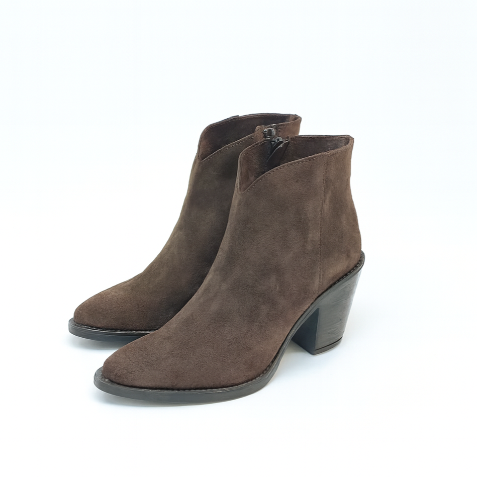 Stile e comfort si incontrano in questo tronchetto dal design texano, realizzato in vero camoscio per un look raffinato e contemporaneo. Il tacco da 7,5 cm slancia la silhouette senza rinunciare alla comodità, mentre il fondo in gomma antiscivolo garantisce stabilità e sicurezza ad ogni passo. La zip interna lo rende pratico da indossare, perfetto per completare outfit casual o più ricercati con un tocco deciso e femminile